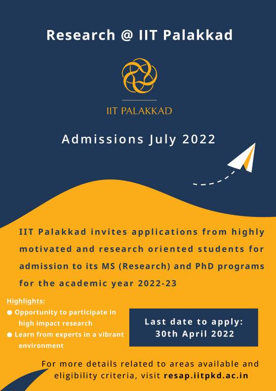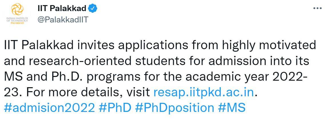 IIT Palakkad Admissions 2022: Indian Institute of Technology (IIT) Palakkad has commenced the admission application process for the research programme. A tweet posted from the official Twitter account of IIT Palakkad reads, “IIT Palakkad invites applications from highly motivated and research-oriented students for admission into its MS and PhD programs for the academic year 2022-23. For more details, visit https://resap.iitpkd.ac.in.” Last date to apply if April 30, 2022.