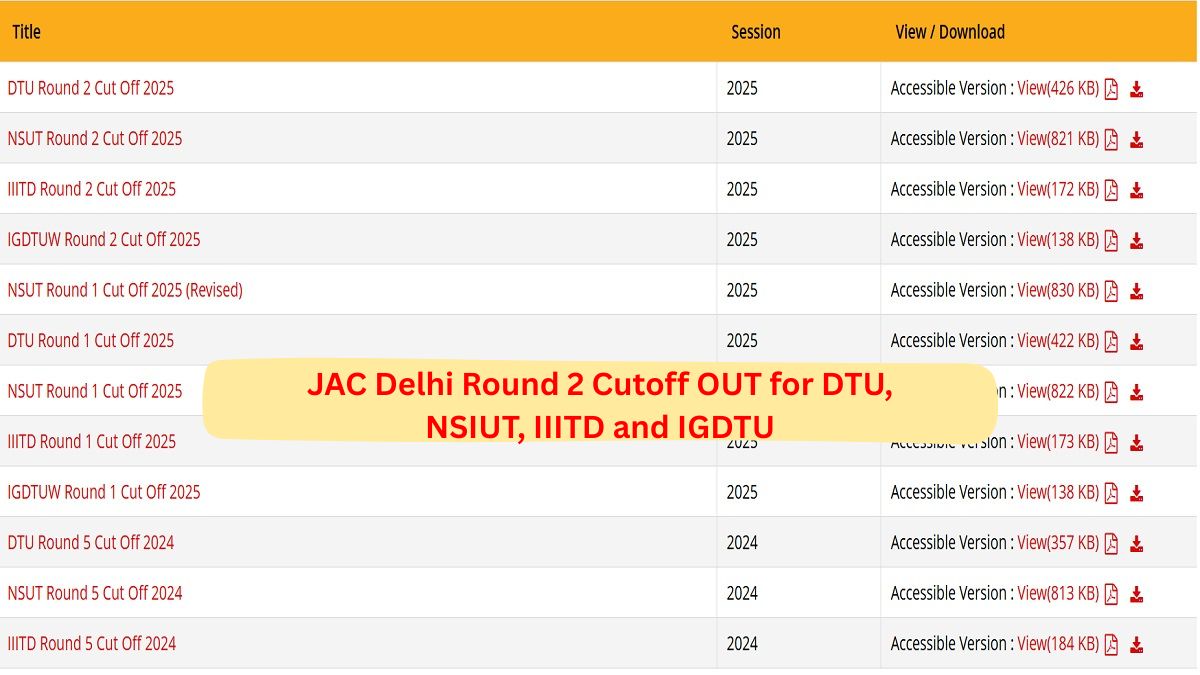 JAC Delhi round 2 cutoff 2025 has been released for DTU, NSIUT, IIITD and IGDTU. Candidates can check subject-wise JAC Delhi round 2 cutoff online at the official website.