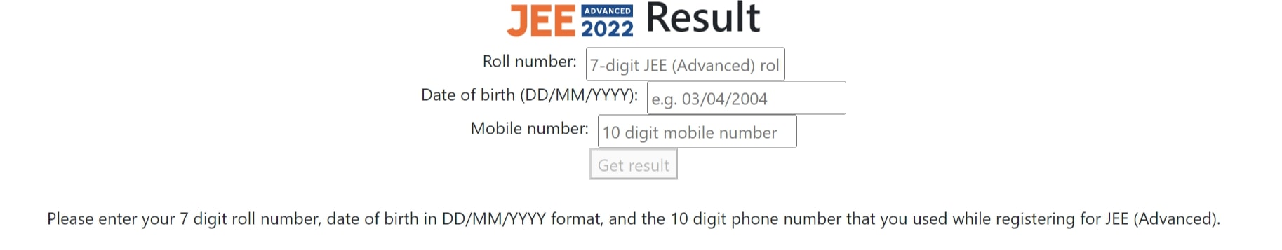 • Enter your 7-digit roll number, date of birth in DD/MM/YYYY format, and the 10-digit phone number that you used while registering for JEE (Advanced), and click on the 'Submit' button.