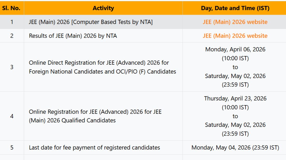 IIT Roorkee has announced the complete JEE Advanced 2026 exam schedule. The registration for JEE Advanced 2026 will open on April 23 for JEE Main-qualified candidates, while the exam will be held on May 17, 2026. Check the event-wise dates below.