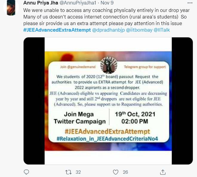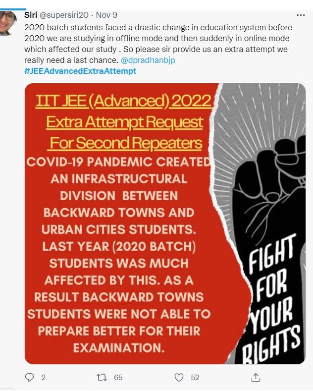 As the candidates continue to speak for their demands, the hashtag “#JEEAdvancedExtraAttempt started trending on Twitter.  A large number of students have thanked Ayush for raising a voice for them. One student tweeted, “Thanks for supporting us #JEEAdvancedExtraAttempt,” while another wrote, “Thanks sir for supporting us #JEEAdvancedExtraAttempt @dpradhanbjp @iitbombay.”
