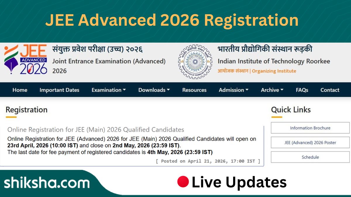 JEE Advanced Registration 2026 Live Updates: The Indian Institute of Technology (IIT) Roorkee will start the JEE Advanced 2026 registration today for JEE Main 2026 qualified candidates. The application form link will be released at 10 am on the website jeeadv.ac.in. To apply for JEE Advanced 2026, candidates will need their NTA JEE Main application number and password. The JEE Advanced registration fee to apply is INR 3200 for unreserved category and 1600 for female and SC/ST/PwD category. The candidates from reserved category also need to upload their category certificates.