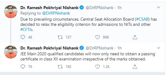 On Thursday, The Human Resource Development (HRD) Minister, Dr Ramesh Pokhriyal has made an important announcement for all JEE Main 2020 aspirants. He shared through a tweet that for admissions into the NITs & other Centrally Funded Technical Institutions (CFTIs), candidates will now only need to obtain a passing certificate of class XII examination or equivalent irrespective of the marks obtained. The HRD Minister said, " Due to prevailing circumstances, Central Seat Allocation Board (#CSAB) has decided to relax the eligibility criterion for admissions to NITs and other #CFTIs".