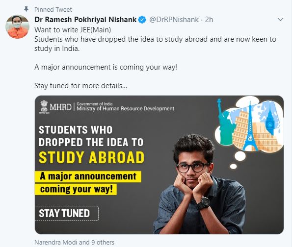 The tweet by HRD minister said, βWant to write JEE(Main). Students who have dropped the idea to study abroad and are now keen to study in India. A major announcement is coming your way! Stay tuned for more detailsβ