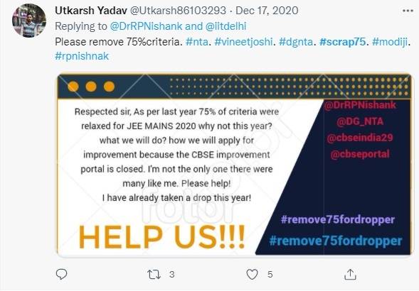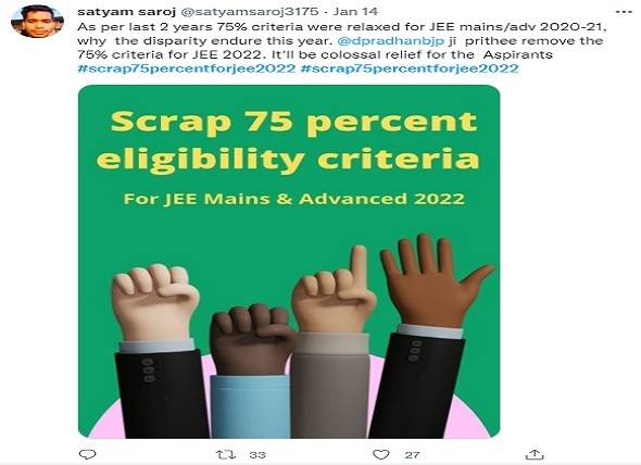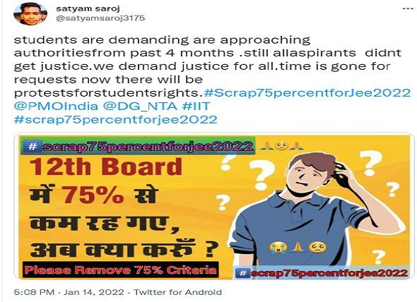 JEE Main 2022: Students demand removal of 75% eligibility criteria, flood Twitter with #Scrap75percentforJee2022