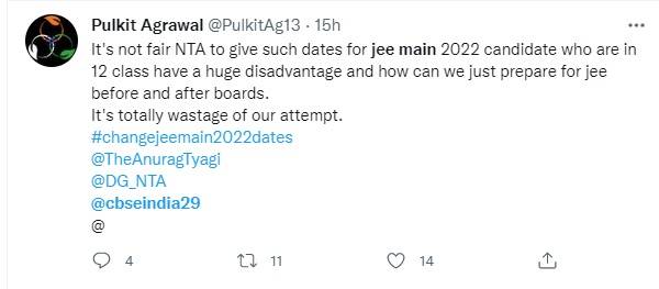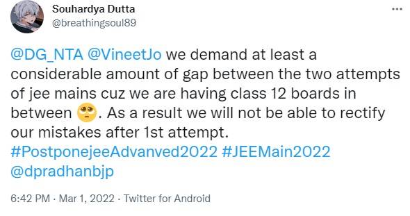 A user wrote, “Please I request NTA to postpone JEE MAIN 2022 (April Slot) as it will be very inconvenient for students who are appearing for board examinations #NTA #JEEMain #CBSE #JEE2022,” another wrote, “#PostponeJEEMain2022 JEE22 Aspirants spent 2yrs online with mere to no guidance, many of them couldn't prepare right due to covid. There are several boards happening across the country. CBSE students also have Term2 boards. Both the attempts of JEE Main sandwich Term2.”