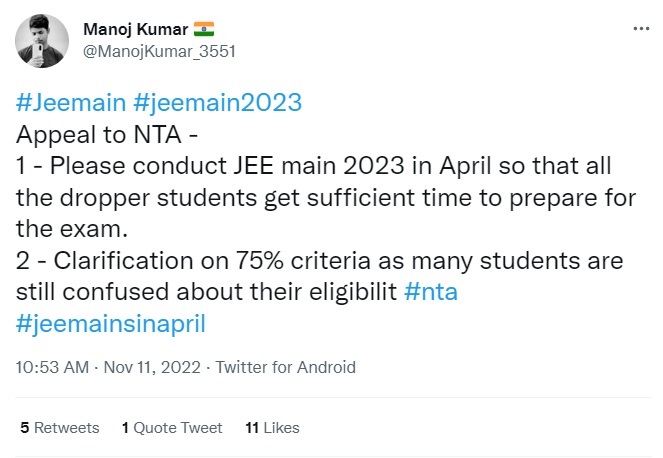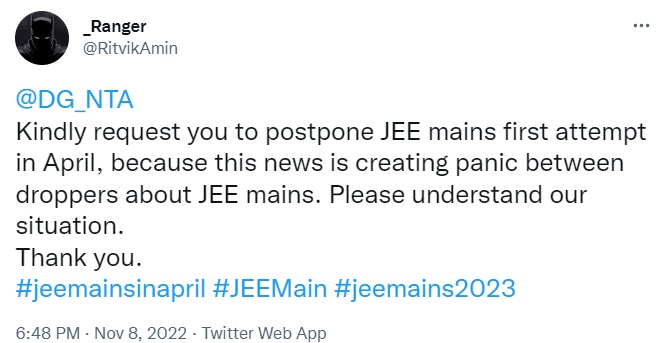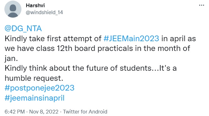 One user wrote, β@DG_NTA COULD U PLEASE CONSIDER CONDUCTING THE JEE MAINS 2023 EXAM IN THE MONTH OF APRIL OR MAY.... A SINCERE REQUEST SIR... AND IF EXAM IS TO BE HELD IN JAN THEN WE DROPPERS ARE GIVEN A TIME OF LESS THAN 6 MONTHS TO PREPARE #justicefordroppers #jeemainsinapril,β while another tweeted, βAs a dropper we are having only 1.5 month to prepare for jee 2023 as counselling ended few days ago, It's a humble request to @DG_NTA that please conduct jee mains 1st attempt in April #jee #nta #jeemainsinapril #jee2023 #JEEMain2023 #jeeinapril #jeemains2023inapril.β