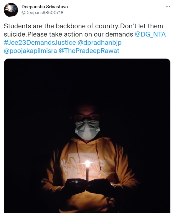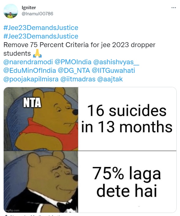 An aspirant tweeted,â#Jee23DemandsJustice Without justice in the world, we cannot have peace-the two are intertwined. Our 3 demand:- 1-postpone january attempt to april 2-remove 75% criteria 3-Give chance to 2021 droppers for jee advanced 2023 @PMOIndia @dpradhanbjp @anubha1812 @poojakapilmisra,â while another wrote, âSince 75% criteria is reimposed for jee mains & advance, we request to remove it for those students who passed board exam in 2021 or 2022 Droppers @PMOIndia @narendramodi @ChauanPayal @dpradhanbjp @OfficeDp @EduMinOfIndia