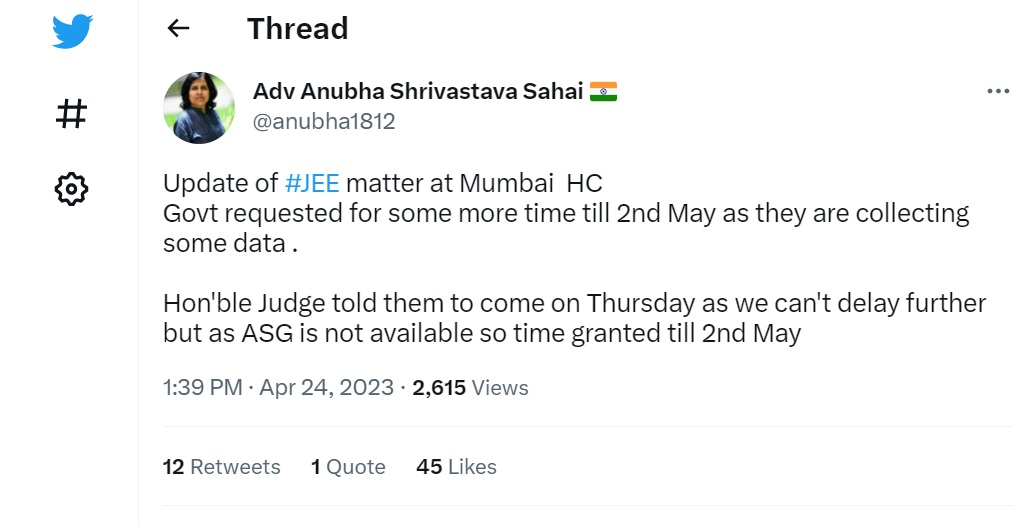As per the latest information, Government requested for some more time till May 2, 2023 as they are collecting some data. Therefore, 75% eligibility criteria plea has been postponed to May 2, 2023. As per Advocate Anubha Sahai, the matter regarding the 75 percent eligibility criteria for the JEE Main 2023 Exam has been listed as item number 52 in the High Court.