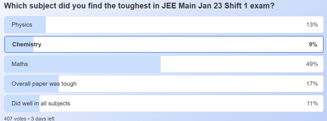 Subject Difficulty Level Key Topics Covered Mathematics Moderate Integration, Coordinate Geometry Physics Moderate Modern Physics, Thermodynamics Chemistry Moderate Organic Chemistry, Physical Chemistry - 7:41 PM IST• 23 Jan 2025