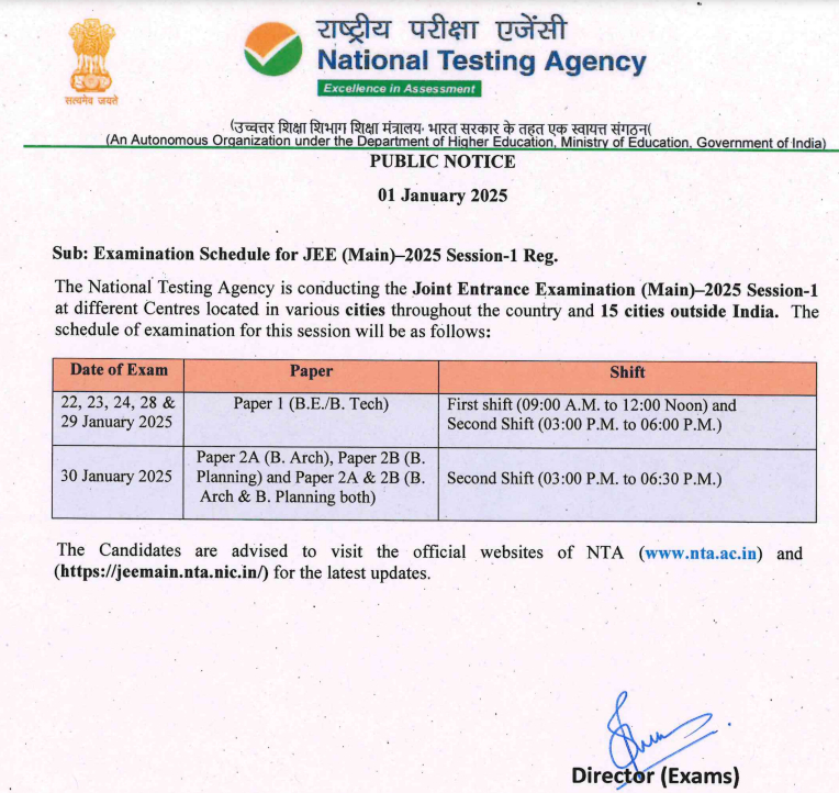 JEE Main 2025 Session 1 Exam Dates Announced at jeemain.nta.nic.in; Paper 2 on Jan 30