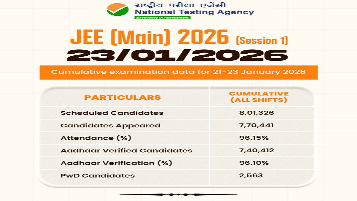 According to NTA data, 7,40,412 candidates were Aadhaar verified, accounting for 96.10 percent of total appeared candidates. JEE Main 2026 session 1 till Jan 23 also witnessed participation from 2,563 Persons with Disabilities PwD candidates, with necessary accommodations arranged at various centres.