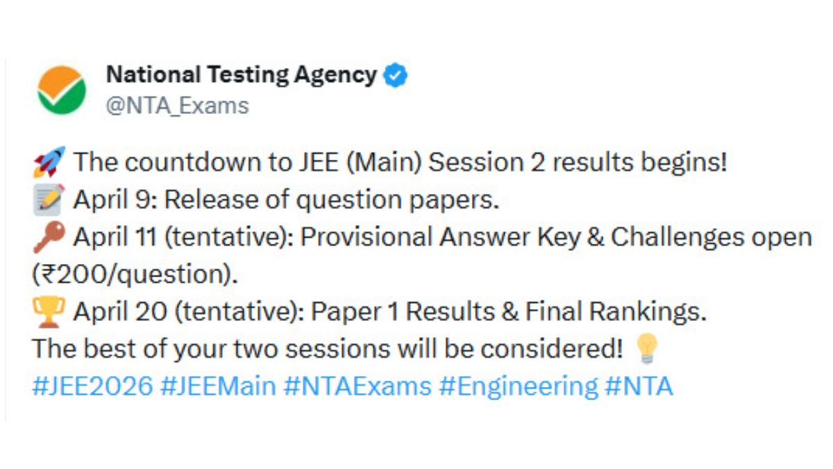 The National Testing Agency (NTA) has announced the upcoming schedule for JEE Main 2026 Session 2 activities. As per the official update, candidates can expect the release of question papers, answer key, and results on April 9, 11 and 20, respectively. The JEE Mains 2026 session 2 exam was held on April 2, 4, 5, 6, 7 and 8. Around 11.23 lakh candidates have appeared for the session 2 exams.