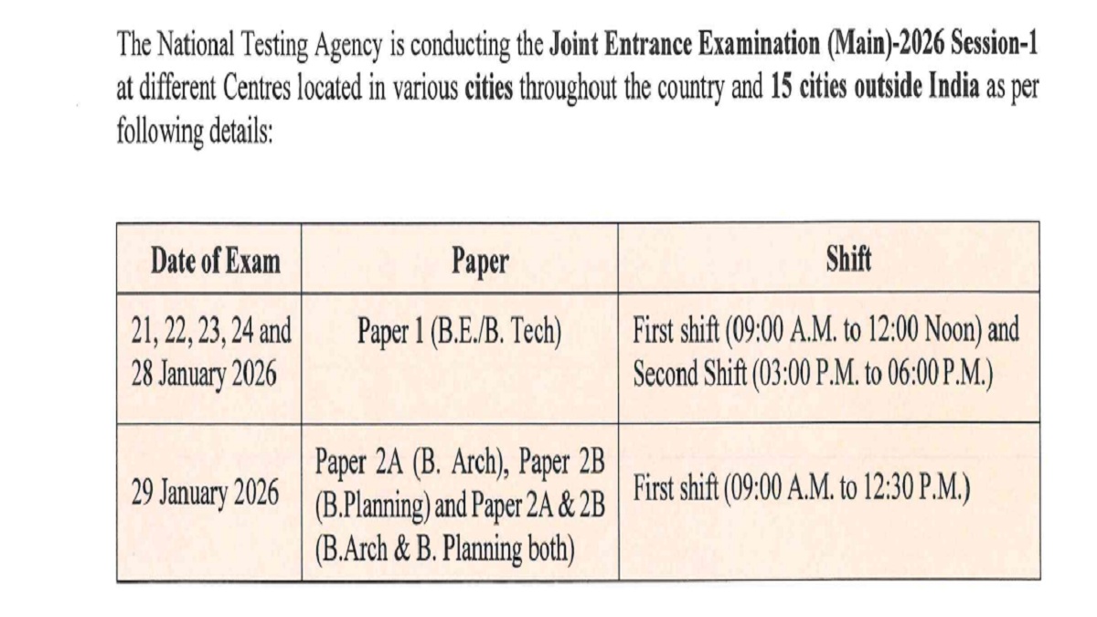 JEE Main 2026: National Testing Agency has released exam schedule along with JEE Main 2026 session 1 admit cards. Candidates who have registered can check dates, reporting times, shift details and exam day guidelines mentioned on JEE Main admit card 2026. As per schedule released, paper 1 (BE/BTech) of JEE Main will be conducted on January 21, 22, 23, 24 and 28, 2026, in two shifts: shift 1 from 9 AM to 12 Noon and second shift from 3 to 6 PM.Â