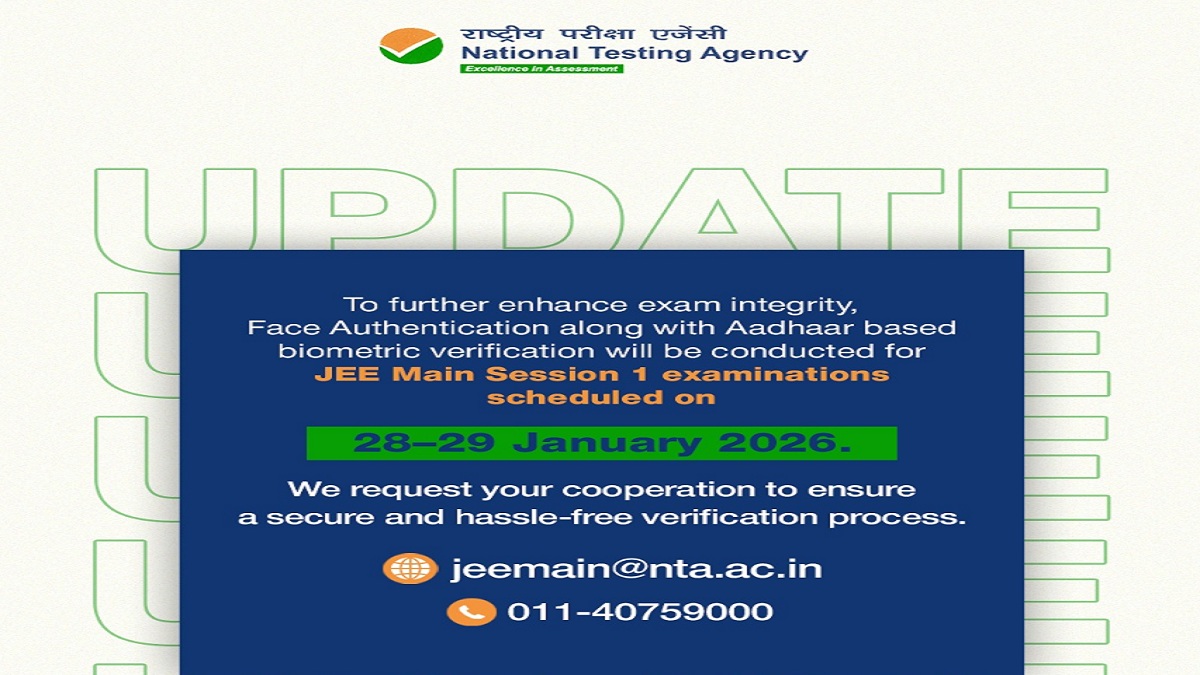 For JEE Main session 1 exam 2026 to be held on January 28 and 29, NTA has introduced face authentication and aadhaar biometrics to enhance security measures. Check notice hereÂ
