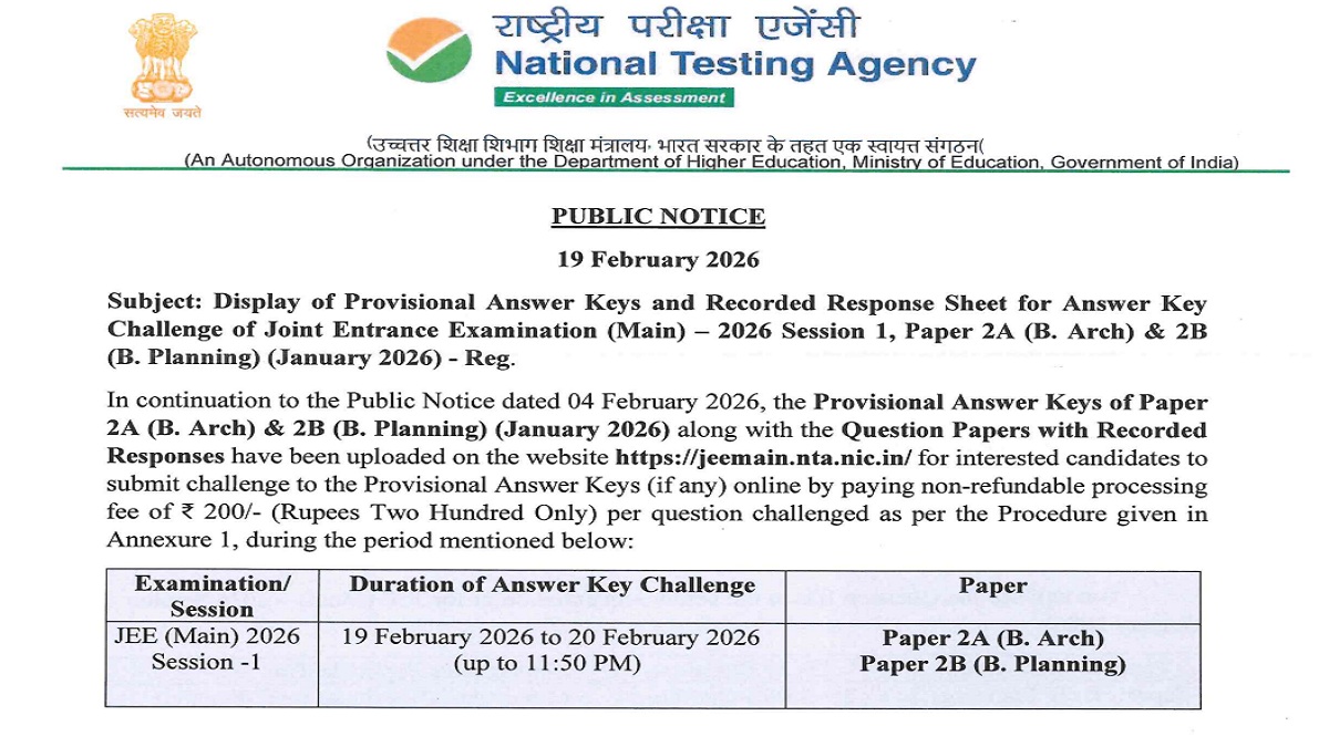 Canbdidates have also been given the opportunity to raise objections in JEE Main paper 2 answer key. Last date to challenge JEE Main BArch answer key 2026 is February 20 by 11:50 PM. They can submit JEE Main answer key challenges online by paying a non-refundable processing fee of INR 200 per question. The fee must be paid through Debit Card, Credit Card, or Net Banking by 20 February 2026 (up to 11:50 PM).