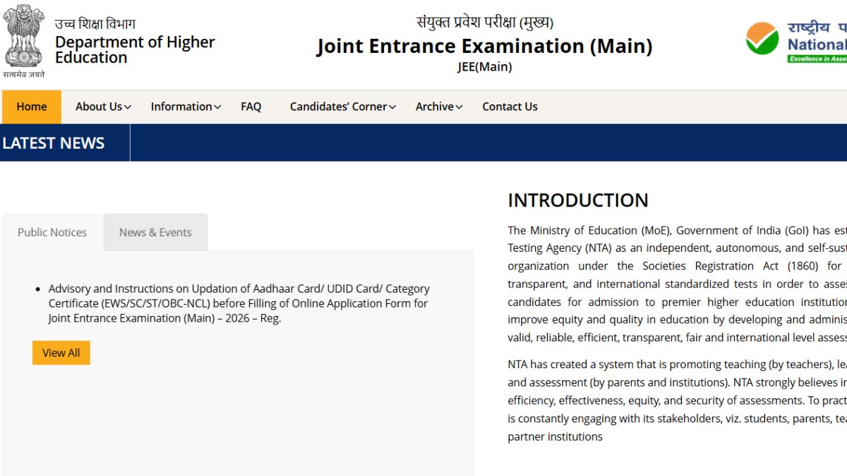The National Testing Agency has issued a public notice asking all the aspirants to get their documents updated prior to the JEE Mains 2026 registration. The authority has specified that the registration will commence in October 2025. With this, the JEE Main official website has also been launched at jeemain.nta.nic.in. Candidates must check the JEE website for all updates.