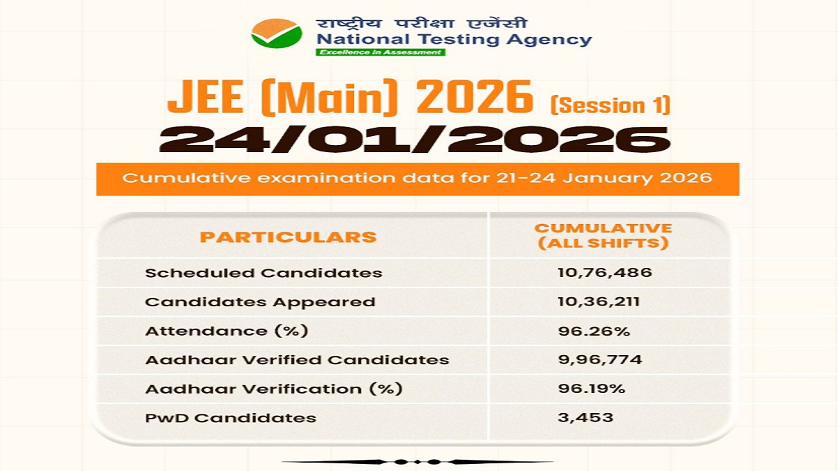 JEE Main Statistics: National Testing Agency reported the smooth and successful conduct of Joint Entrance Examination Main 2026 session 1 during the initial four days of the exam, held from January 21 to 24. According to data released by NTA, a total of 10,36,211 candidates appeared for JEE Main 2026 during this period. The exam recorded a high attendance rate of 96.26 per cent.