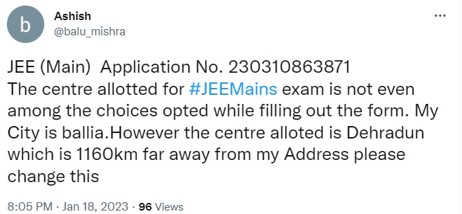 Several students have informed that the JEE Main exam city allotted to them is far away from their home town. A candidate said on Twitter, "my jee main exam center is given in dehradun which is about 1200km away from my home and i didn't filled it in preferences.