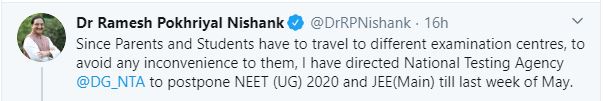 HRD Minister of India, Dr Ramesh Pokhriyal, has directed the National Testing Agency (NTA) to postpone JEE Main 2020 April exam till the last week of May. This step has been taken due to the Coronavirus outbreak in the country and keeping in mind the safety of the students. HRD Minister further advised all the students to utilise their time to study and prepare for their examinations and be safe at their homes.