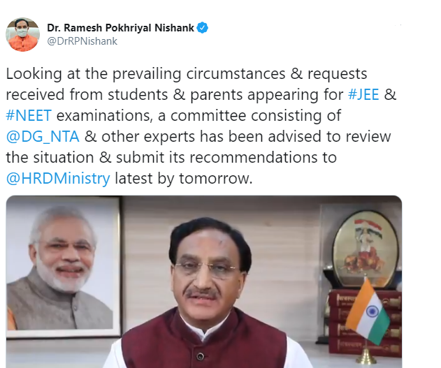 The official tweet posted by the HRD Minister regarding the NEET 2020 and JEE Main 2020 Dates states, βLooking at the prevailing circumstances & requests received from students & parents appearing for #JEE & #NEET examinations, a committee consisting of @DG_NTA & other experts has been advised to review the situation & submit its recommendations to @HRDMinistry latest by tomorrow.β