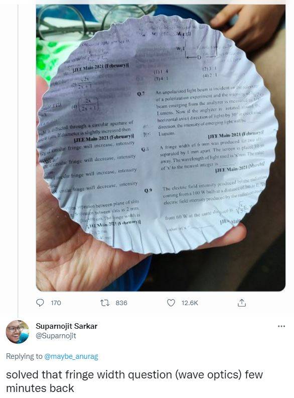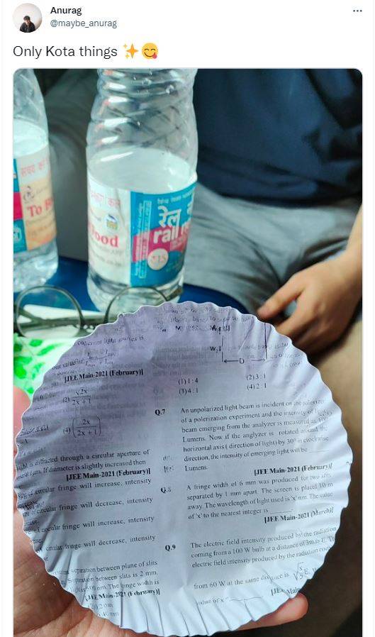 Surprisingly, it is not any bizarre JEE question that has become the talk of the town but the form of the JEE question paper. With just a few days left for the entrance exam, an old JEE Main question paper turned into a paper plate has gone viral on social media. The picture posted by Twitter user Anurag shows a paper plate made using JEE Main 2021 question paper. The Twitter user shared the picture with the caption, "Only Kota things". From the image, it appears that Anurag was on a train in Kota where he got some snacks on a JEE main question paper turned paper plate.