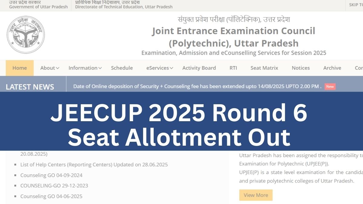 The Joint Entrance Examination Council, Uttar Pradesh (JEECUP) has released the UP Polytechnic seat allotment 2025 for round 6 on August 26. The JEECUP 2025 seat allotment link is updated on the website, jeecup.admissions.nic.in. Candidates require their application number and password to check the JEECUP round 6 allotment result. The seat allotment letter includes the candidate's details, name and address of the allotted college, allotted stream and more.