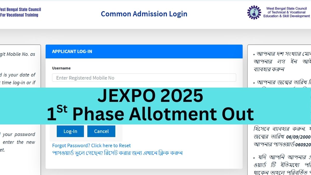 The West Bengal State Council of Technical Education (WBSCTE) has published the JEXPO 2025 seat allotment for the first phase of counselling. Candidates can check the allotment results using their application number and password. Know what to do next and how to confirm your admission here.