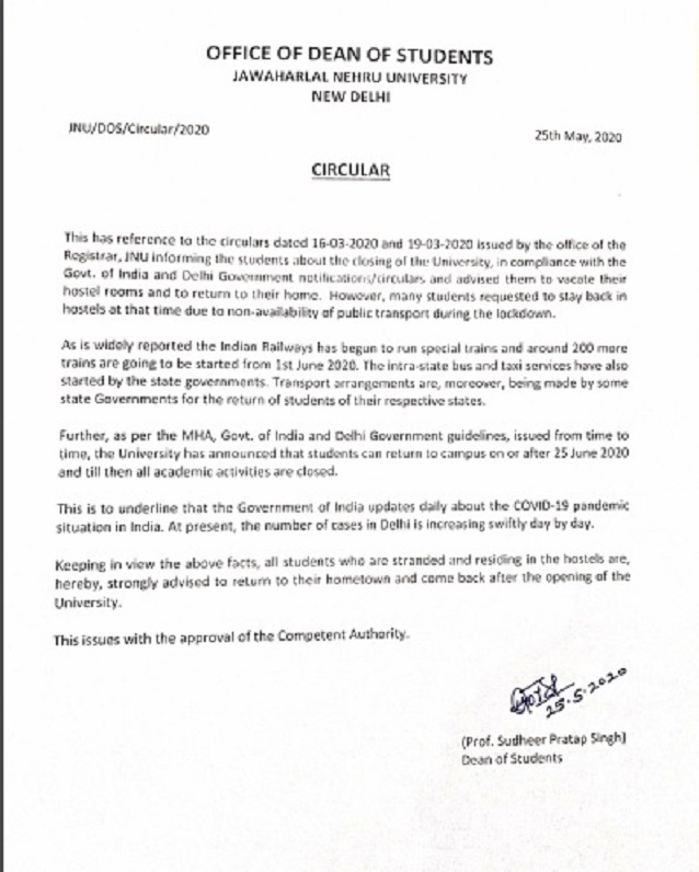 In a circular issued by Sudheer Pratap Singh, Dean of Students, JNU, students have been asked to return to their hometown in view of the resumption of transport facility and an increasing number of coronavirus infection cases in Delhi.