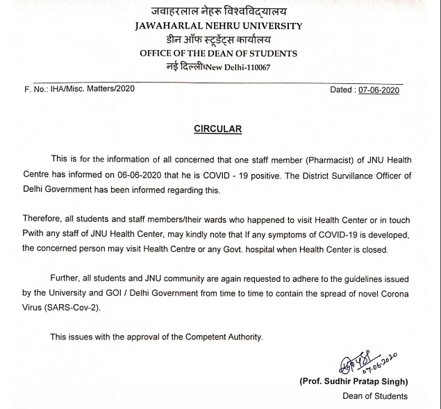 JNU Health Centre Pharmacist tests positive for COVID-19; Students urged to return home