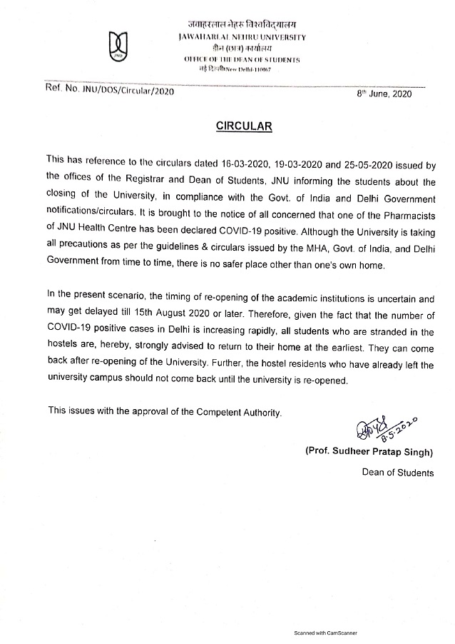 On May 25, the varsity had strongly advised the students stranded in its hostels to return to their native places as special trains and some inter-state bus services have become operational following relaxations in the coronavirus-induced lockdown norms. On June 7, a pharmacist at JNU Health Centre had tested positive for COVID-19. This is the first reported instance of a COVID-19 patient inside the university.
