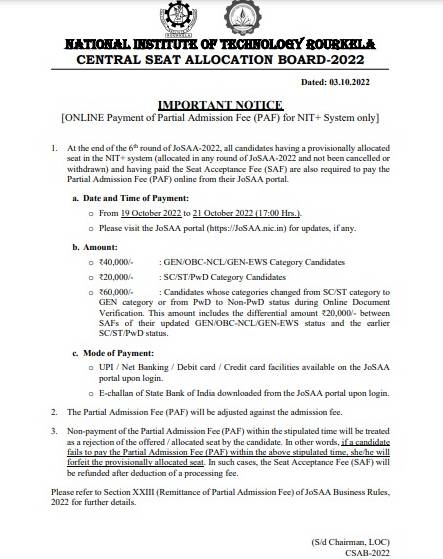 As per the official announcement, "All candidates having a provisionally allocated seat in the NIT system and having paid Seat Acceptance Fee (SAF) are also required to pay the Partial Admission Fee (PAF) online from their JoSAA portal during 19 Oct – 21 Oct 2022 (17:00 Hrs). Non-payment of the PAF within the stipulated time will lead to cancellation of the allocated seat."