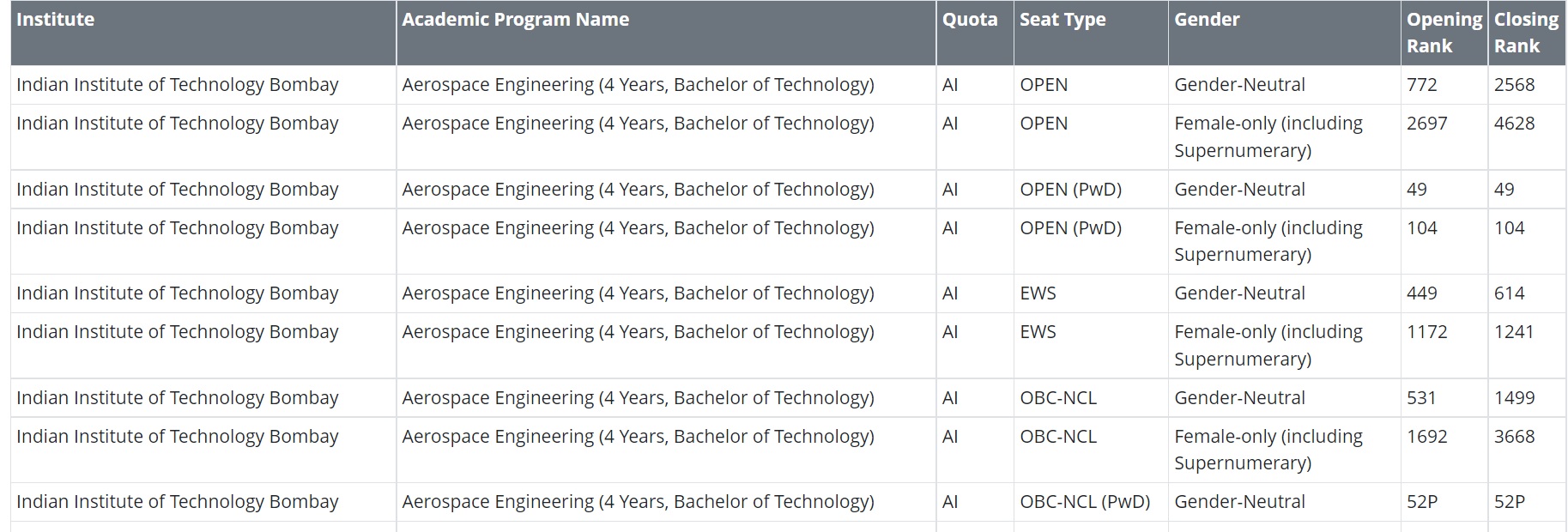 Check below the JoSAA 2023 Cutoff for IIT Bombay Round 1: