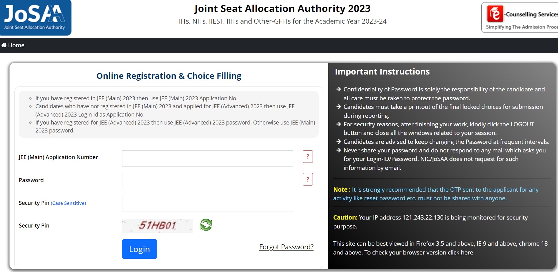 - Enter JEE Main/JEE Advanced 2023 application number, password and security pin.