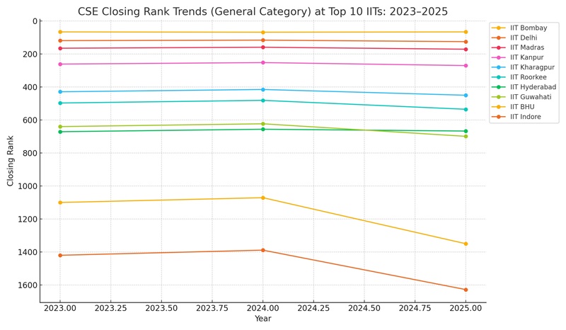 The 2025 cut-off data clearly affirms that IIT Bombay, Delhi, and Madras continue to dominate the preferences of top-ranking students aspiring for CSE. The closing ranks for these three institutes remain under AIR 180, reflecting their consistent reputation, top-tier placements, and deep research exposure in the field of computer science.