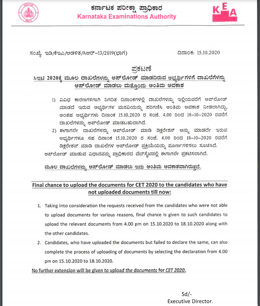 So, after considering their requests, KEA has decided to provide a final chance to upload documents from October 15 to October 18. Candidates who have missed their schedule can upload the documents by visiting the official website i.e. cetonline.karnataka.gov.in.