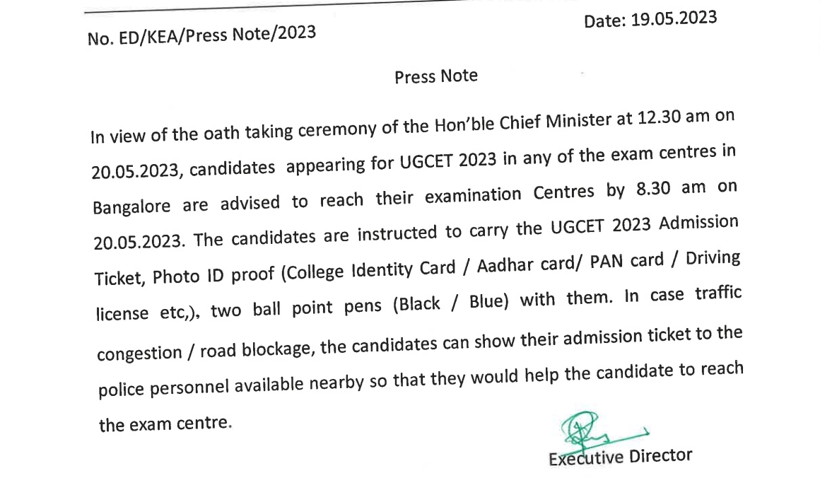 KCET 2023 exam date is May 20 & 21. In view of the oath taking ceremony of Karnataka Chief Minister, the exam authority has issued a special traffic advisory for students. Applicants are advised to reach the exam centre at 8:30 AM for papers today. Along with the KCET admit card 2023, candidates also need to carry their one valid photo ID proof and two ballpoint pens.
