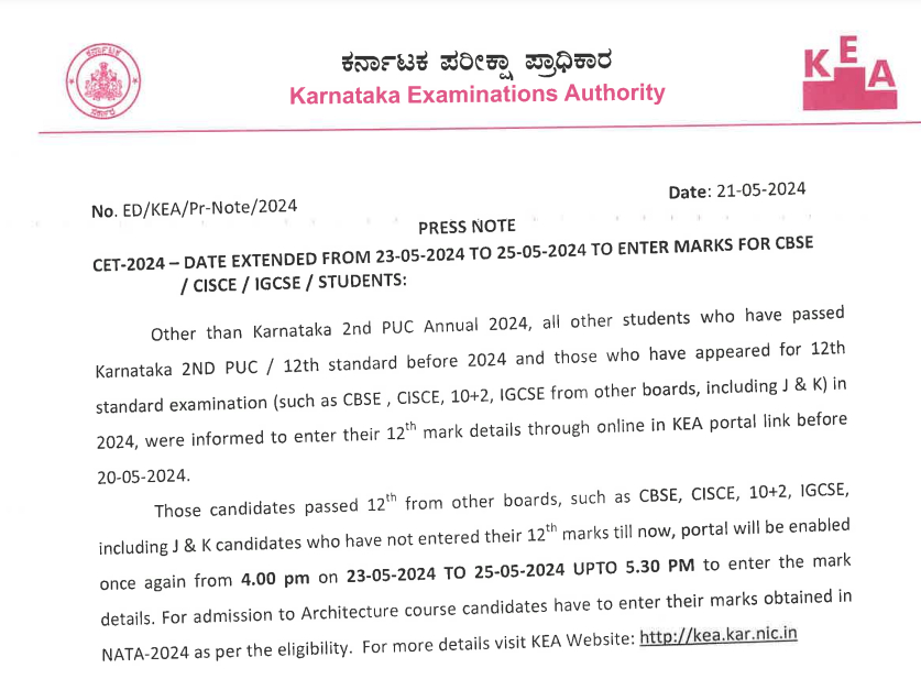 Previously, KCET marks entry link 2024 was activated from May 14 to 20. KCET 2024 exam was conducted on April 18 & 19 in offline pen & paper mode. KCET 2024 result date was May 20. However, KEA has postponed the KCET result 2024 announcement date.