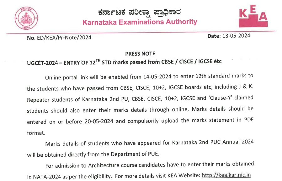 KEA has also informed that marks of students from Karnataka who appeared in 2nd PUC exam this year will be directly obtained from the department concerned. Such candidates are not required to update their score through KCET marks entry facility 2024.