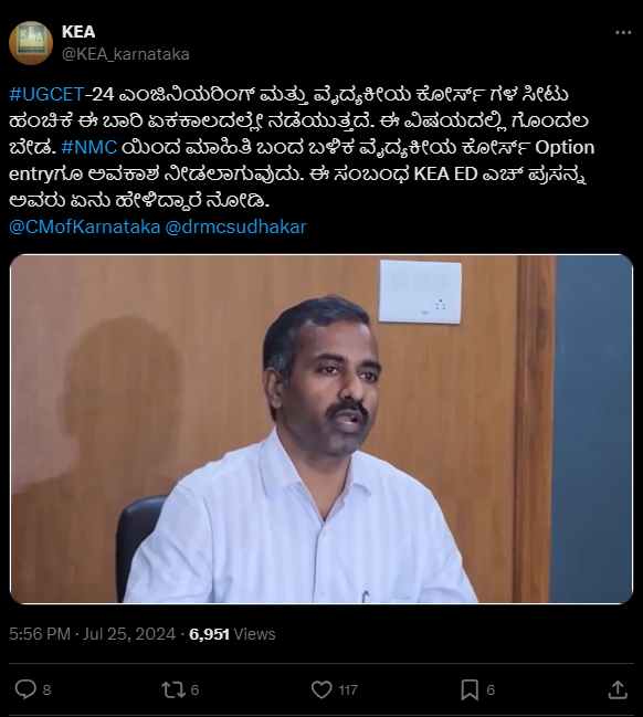 KCET Counselling 2024: Karnataka Examination Authority has released the important instructions for KCET 2024 counselling process. KEA ED H Prasanna has shared a video on social media platform X (formerly Twitter). This year KCET counselling will be conducted simultaneously for all the courses. Applicants need to login using hall ticket number to complete KCET option entry 2024. Candidates need to complete the option entry KCET 2024 for all the courses. KEA has advised applicants not to get confused at the time KCET option entry.