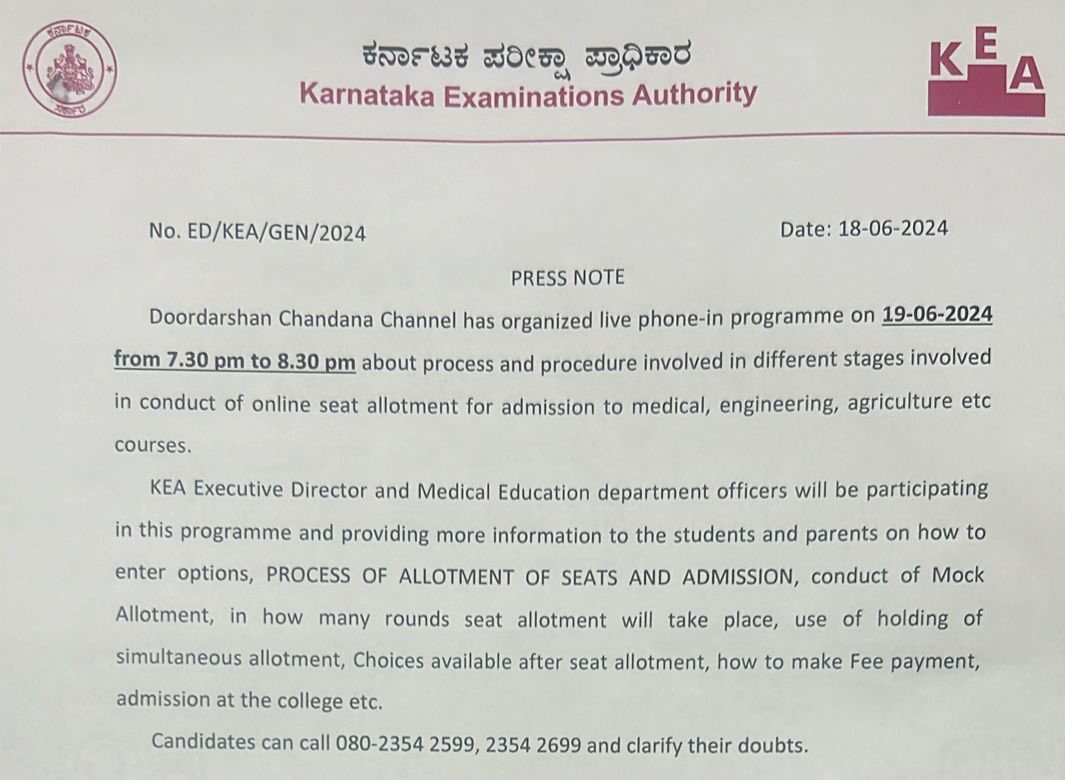 Candidates will be provided with information regarding registration, mock seat allotment, documents required for KCET counselling and others through phone-in program. Applicants looking for admissions are advised to attend the session to get their doubts clear regarding KCET counselling process 2024.