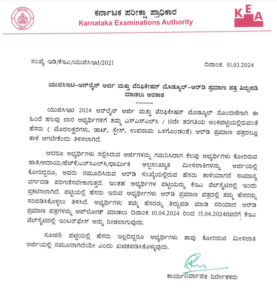 KCET Application Form 2024: Karnataka Examination Authority has concluded the KCEY registration 2024 on February 23. The exam authority has notified names of candidates having mismatched in their names as per RD certificate at cetonline.karnataka.gov.in. Candidates whose details are correct in SSLC/10th marksheet but now matching with RD certificate are advised to correct their information in KCET 2024 application form.