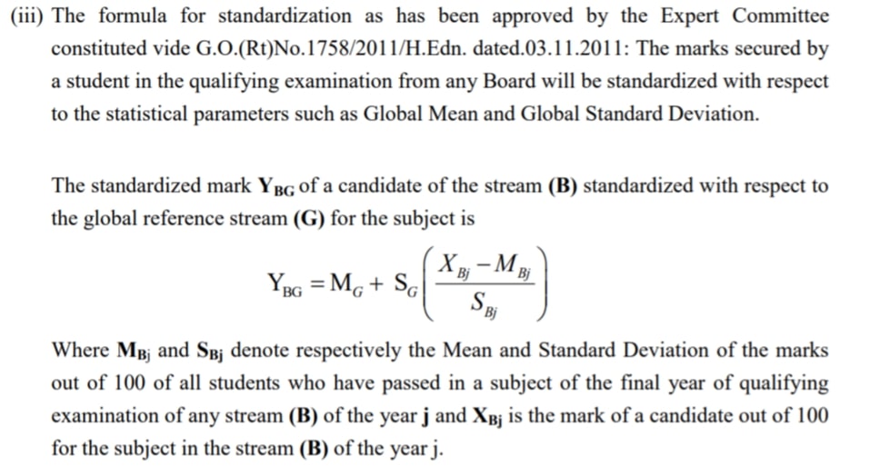 To prepare the engineering rank list equal weightage of 50:50 shall be given to the score obtained in the Entrance Examination for Engineering (Paper I & Paper II put together), and the grade/marks obtained in the final year of the qualifying examination for Mathematics, Physics and Chemistry put together, after effecting the standardization procedure.