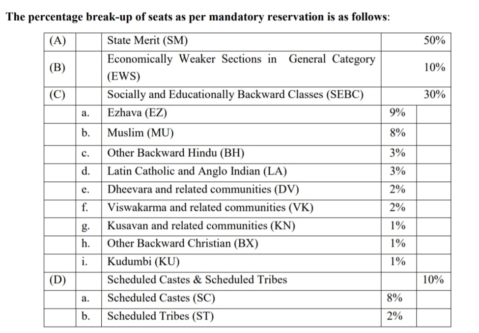 Seats will be reserved doe various categories during admission. The reservations percentage in KEAM 2022 admission process is as follows: