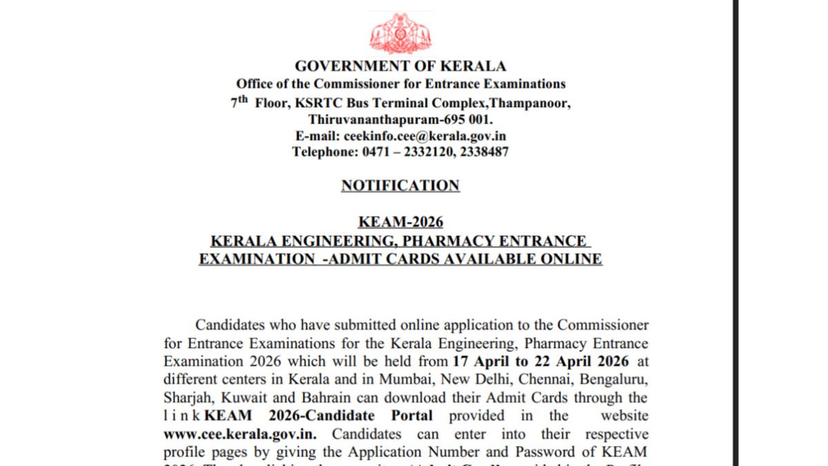 Along with the revised exam dates, the KEAM 2026 admit card has been released on the official website. Candidates who have successfully submitted their application forms can download their hall tickets by logging into the KEAM Candidate Portal at cee.kerala.gov.in using their application number and password.