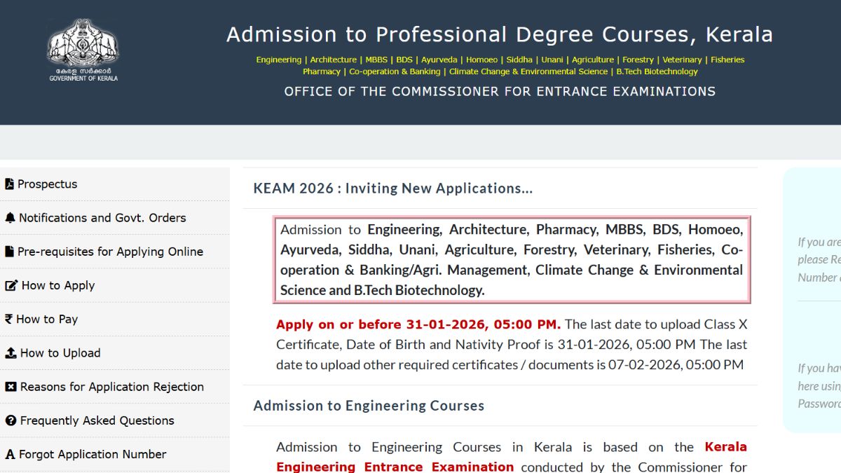 The Commissioner of Entrance Examination (CEE) has started the KEAM 2026 registration on January 5, 2026. Candidates can access the KEAM application form 2026 on the official website, cee.kerala.gov.in. Aspirants must fulfil the eligibility criteria before applying online. The KEAM 2026 registration last date is January 31, 2026 (5 PM). However, the certificates can be uploaded till February 7, 2026.