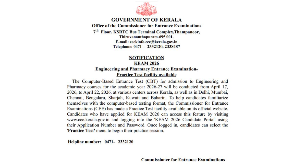 The Commissioner for Entrance Examinations (CEE) will conduct the KEAM 2026 exam from April 17 to April 22, 2026. The exam will be held at multiple centres across Kerala and in selected cities, including Delhi, Mumbai, Chennai, Bengaluru, Sharjah, Kuwait and Bahrain. To help candidates prepare for the exam, CEE has activated a Practice Test facility on its official website. The practice test is designed to familiarise candidates with the computer-based exam format, navigation, and question interface.