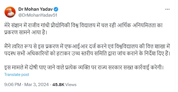 Mohan Yadav, CM of Madhya Pradesh, in a tweet, said: “An incident of ongoing financial irregularities in Rajiv Gandhi Technological University has come to my notice.”