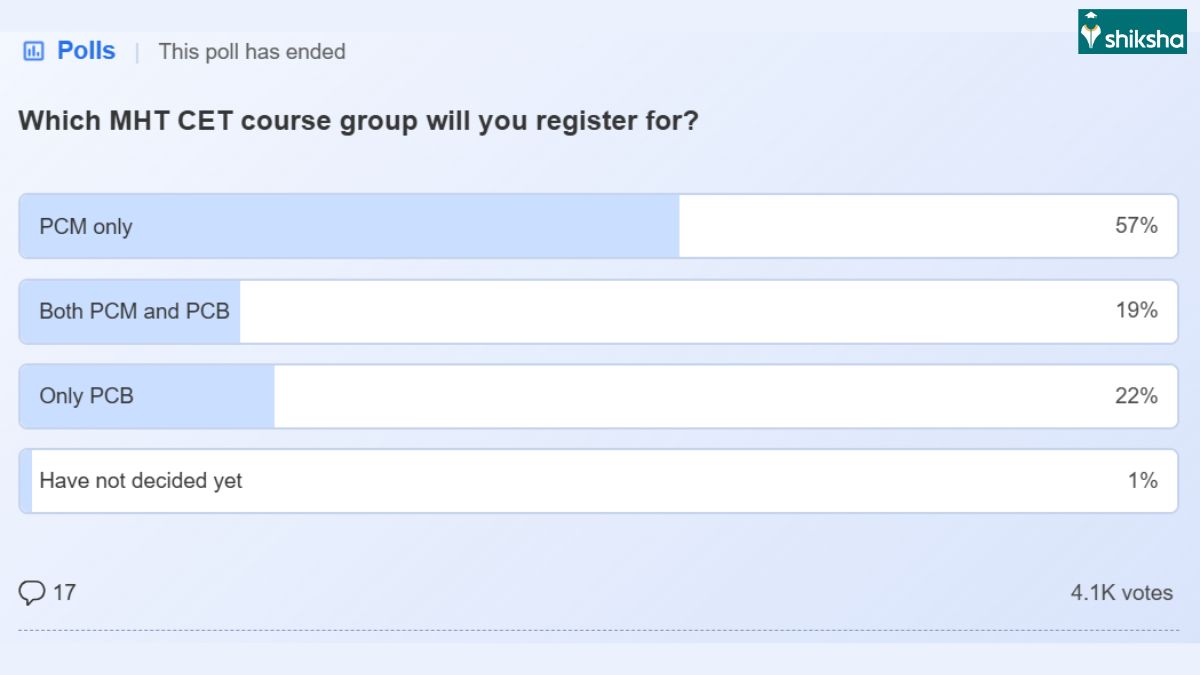 Shiksha regularly conducts polls on MHT CET exam 2026 to understand the current mindset of aspirants and for insights on the exam and admission process by interacting with the students first-hand. Our most recent poll was on 'Which course groups students are applying for?' More than 4.1K students participated in the poll. The results of the poll highlight that students who are applying for MHT CET 2026 have a clear preference for the course group. A clear majority of aspirants (57% voters) are applying for the PCM (Physics, Chemistry, Mathematics) group. This suggests that most students are focused on engineering and technology-related undergraduate programmes through MHT CET.