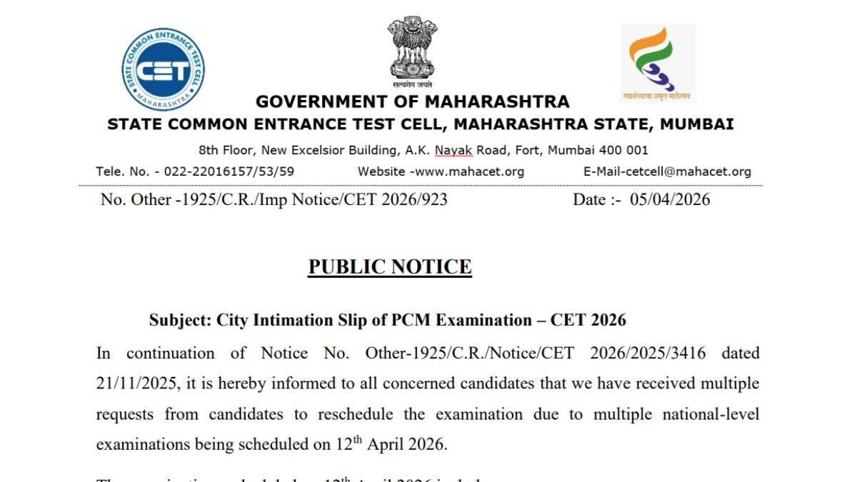 The State Common Entrance Test Cell, Maharashtra, has released an important notice announcing a change in the MHT CET 2026 exam date. The officials have revised the dates due to clashes with other national-level exams. In the notice, dated April 5, the authorities mention that many students requested a change in dates because major exams were scheduled on April 12, 2026. These include NDA, CDS, and NATA exams.